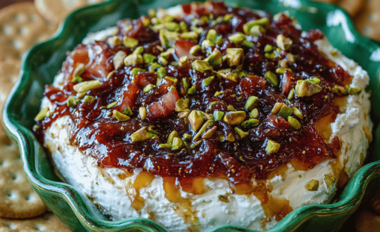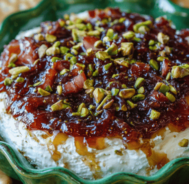 Bake for 8-10 minutes or until warmed through, then sprinkle chopped pistachios on top and serve with crackers. This dip is best warm or even room temperature vs. piping hot.