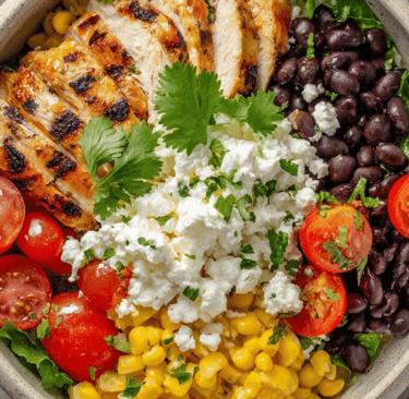 In a bowl, layer cottage cheese, grilled chicken, black beans, corn, and diced tomatoes.